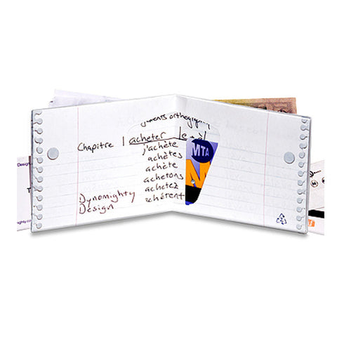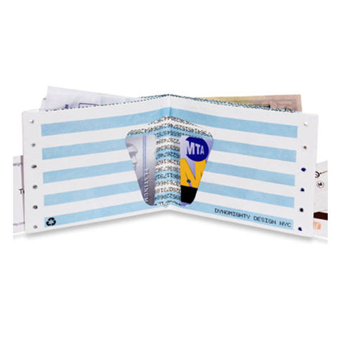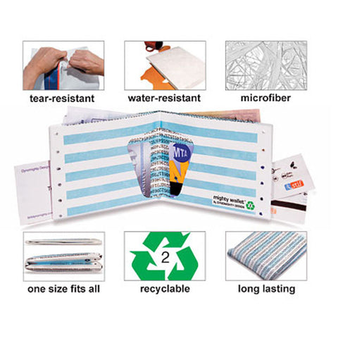The Mighty Wallet™ is tear-resistant, water-resistant, expandable and, most importantly, recyclable. Made from Tyvek® (think express mail envelopes), the Mighty Wallet™ resists tearing because of thousands of interlocking plastic fibers spun in random patterns giving the wallet incredible strength. The ingenious origami design reinforces that strength by using a single folded stitch less construction allowing the wallet to gradually expand and adapt to meet your own personal storage needs. The Mighty Wallet™ will expand right before your eyes (see video). Because of the slim, lightweight and water resistant features, you can take your Mighty Wallet™ anywhere. It makes a great “night out” wallet for a slender silhouette and the writable surface conveniently acts as a quick note pad on the go. In time, the Mighty Wallet™ will gradually soften and patina but, even after years of wear, it will still offer surprise and solicit intrigue. Other great features about the Mighty Wallet™: - Printed with SGS Certified Environmentally Friendly Ink. - 100% recyclable packaging made from recycled PET plastic. - 2 interior pockets, 2 credit card pockets (holds approx 16 cards) and 2 quick access business card pockets. open – 8 w x 3.25 h x .125 d