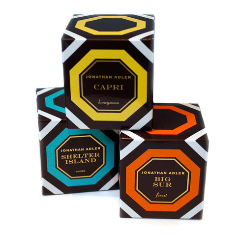 Jonathan Adler scented candles come in three sumptuous scents inspired by some of his favorite destinations.